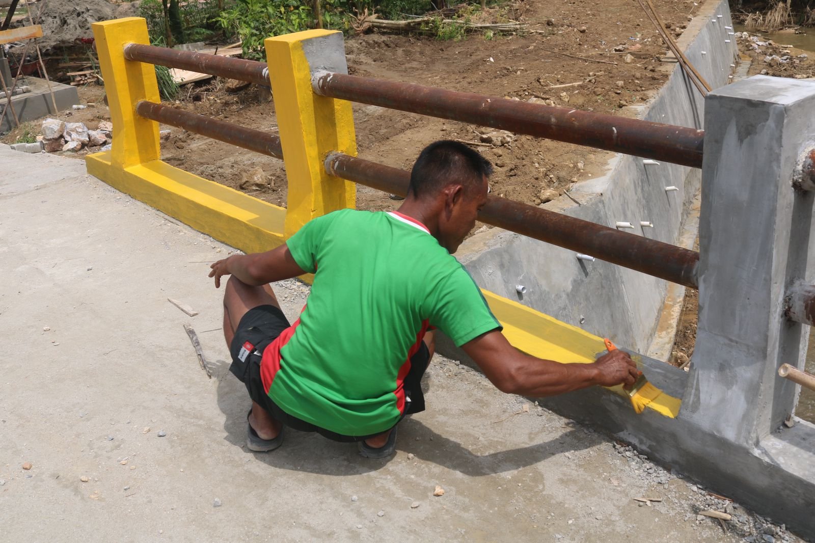 Pada tahap pekerjaan saat ini, sejumlah anggota Satgas terlihat melaksanakan pengecatan pagar jembatan yang menjadi salah satu akses penting bagi masyarakat setempat.