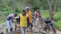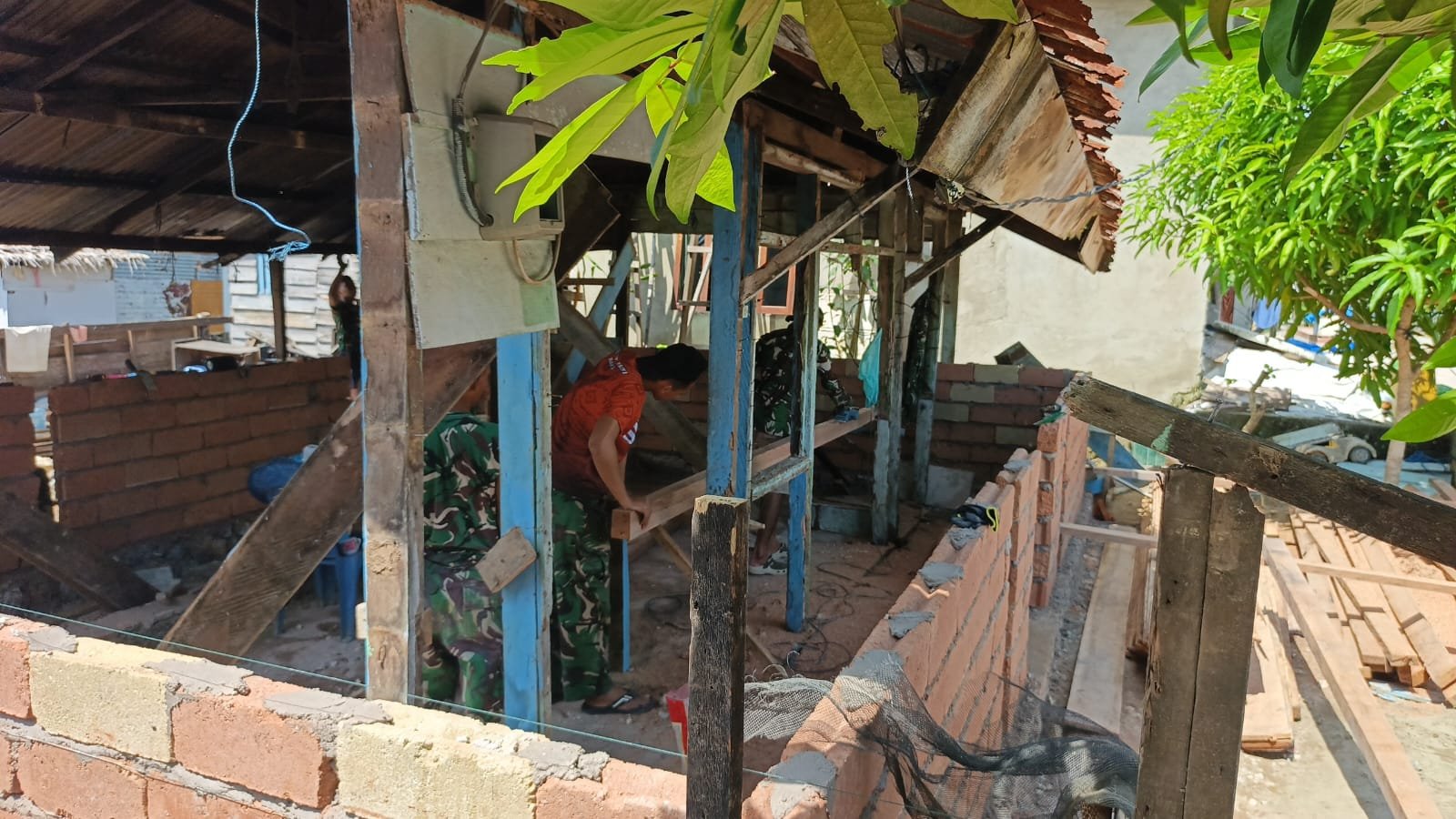 Semangat kerja para prajurit tampak tidak surut meski harus bekerja di bawah terik matahari. Mereka saling berbagi tugas, mulai dari menyiapkan adukan semen hingga merapikan permukaan dinding agar hasilnya maksimal.