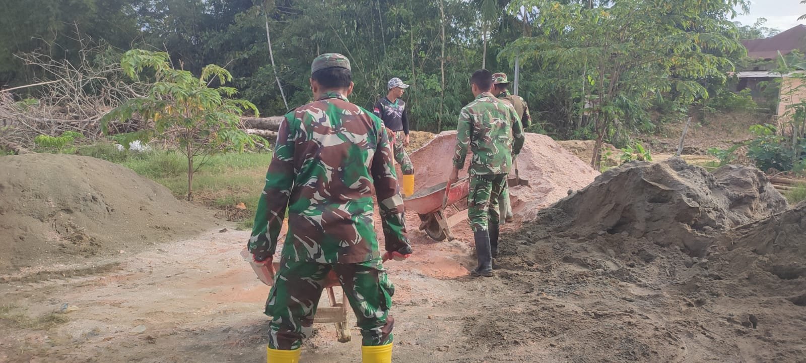 Meski medan cukup menantang, semangat gotong royong tetap menjadi energi utama di lapangan. Distribusi material yang dilakukan bertahap menjadi bagian penting dalam menjaga kelancaran pengerjaan.