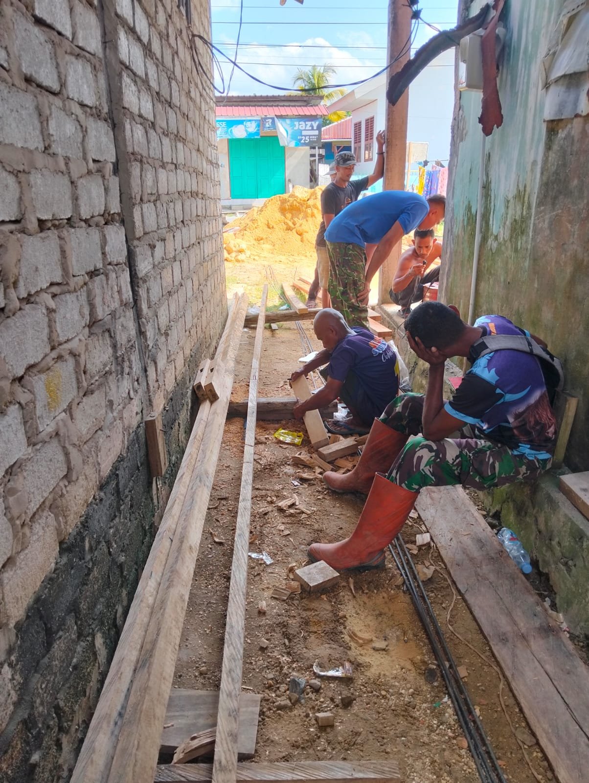 Di tengah teriknya matahari, prajurit TNI dan masyarakat tampak kompak memahat serta membentuk balok-balok kayu secara manual untuk dijadikan rangka bangunan rumah.