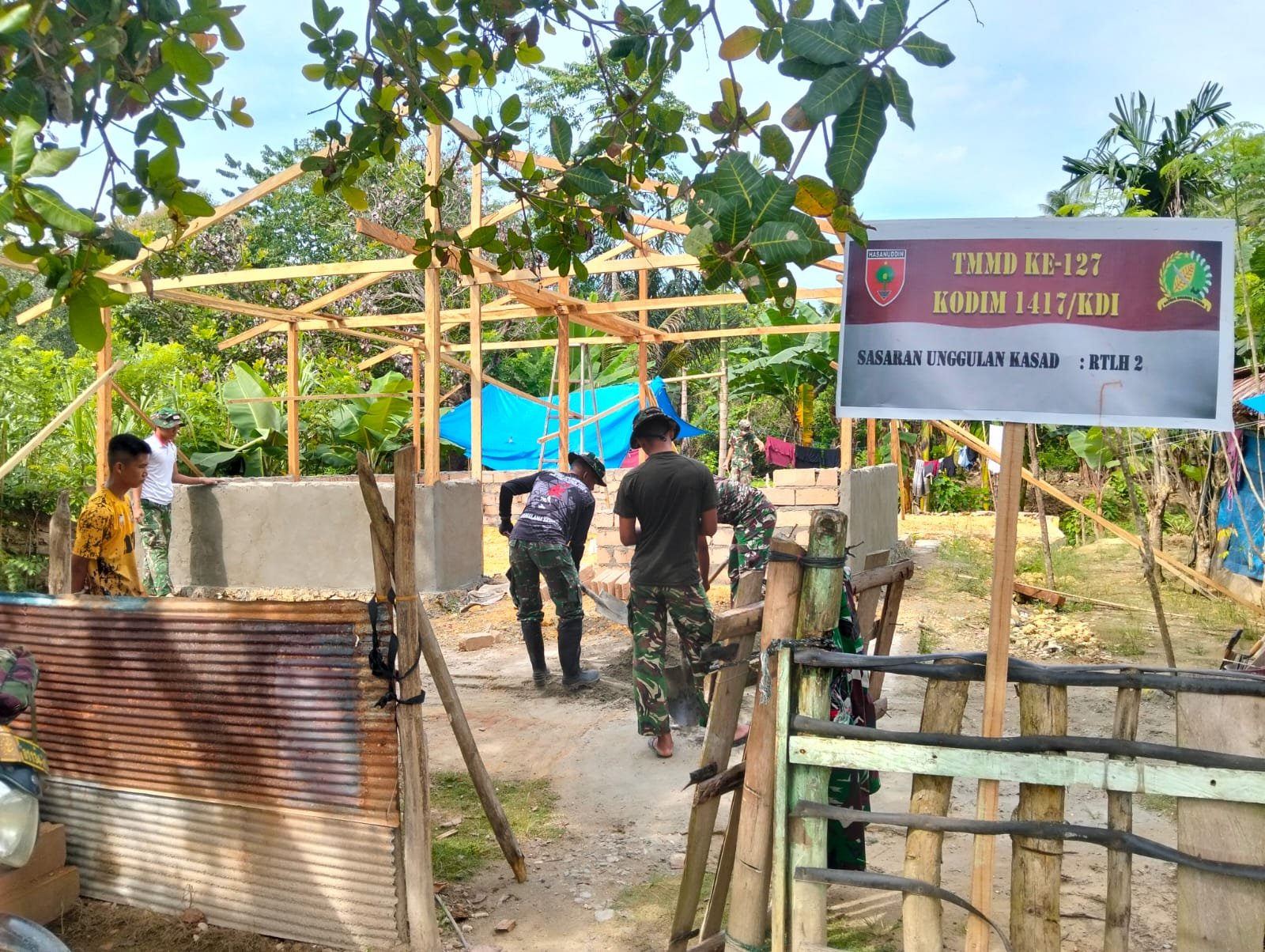 KENDARI – Harapan masyarakat untuk memiliki rumah yang layak huni mulai terwujud melalui program TNI Manunggal Membangun Desa (TMMD) ke-127 yang dilaksanakan oleh Kodim 1417/Kendari, Jumat (6/3).