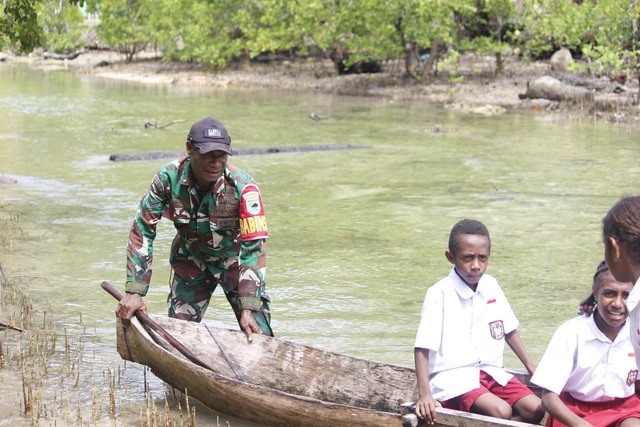Satgas TMMD 127 Kodim 1804/Kaimana Antar Anak Kampung Marsi Sekolah Lewat Jalur Laut