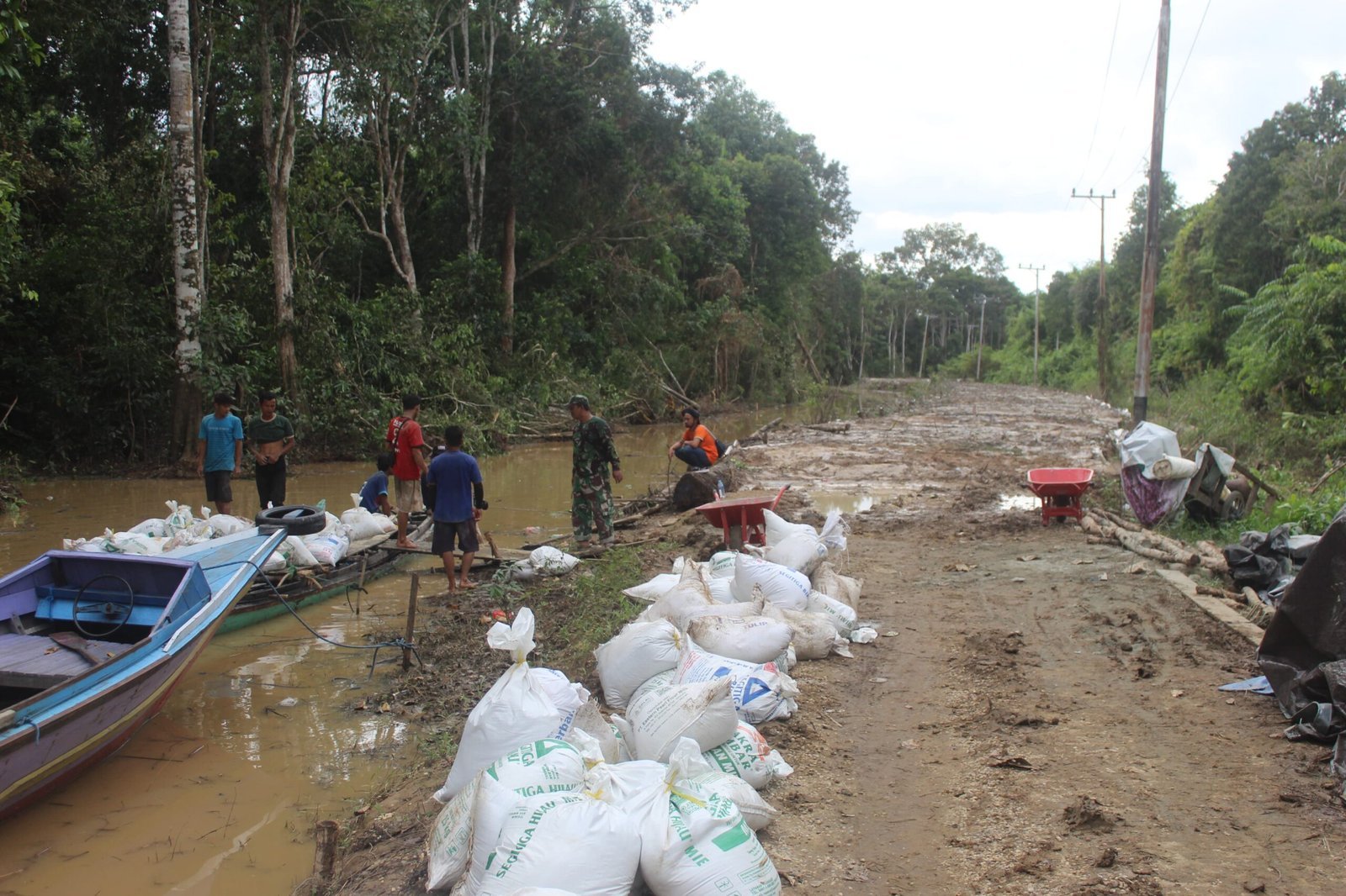 Karena keterbatasan akses kendaraan, pengangkutan material harus dilakukan secara manual. Satgas dan warga membentuk barisan kerja yang terorganisir, memindahkan karung berisi semen dan pasir dengan semangat dan kerja sama yang tinggi.