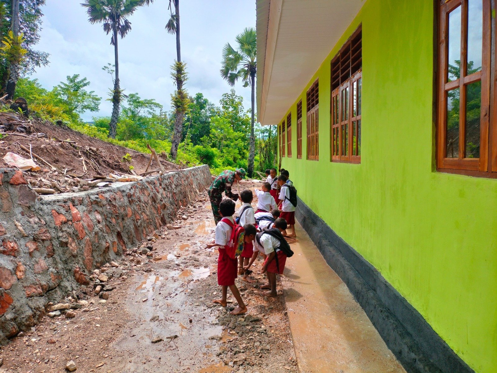 Dengan penuh semangat, anak-anak dan prajurit TNI bahu-membahu mengumpulkan sampah, merapikan halaman, dan membersihkan sisa material bangunan. Keceriaan terlihat di wajah para siswa yang merasa bangga bisa ikut berkontribusi.