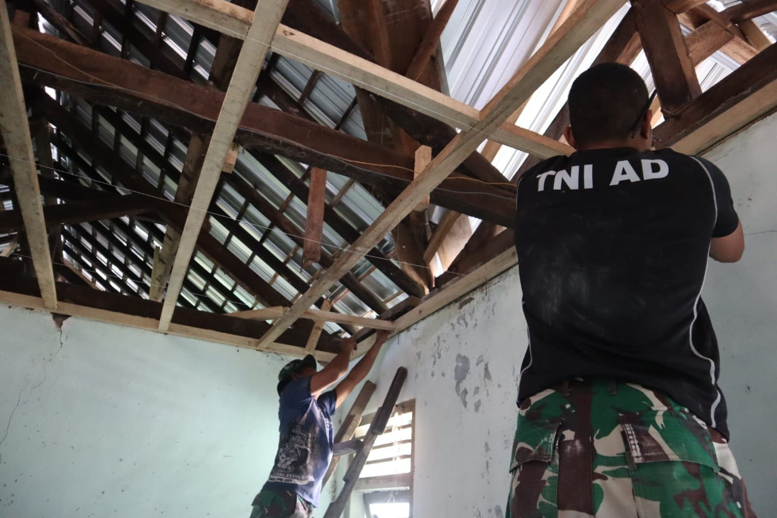 Meski cuaca panas menyengat, personel Satgas dan masyarakat tetap semangat melanjutkan pemasangan plafon di ruang pelayanan.
