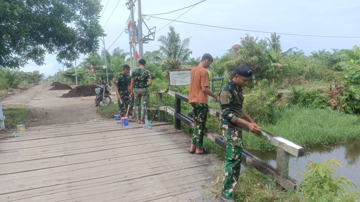 Sukamara – Personil Satgas TMMD ke 123 Kodim 1014/Pbn bersam warga setempat gotong royong mengecat jembatan di Desa Nibung, Kecamatan Jelai, Kabupaten Sukamara, Rabu (05/03/2025).