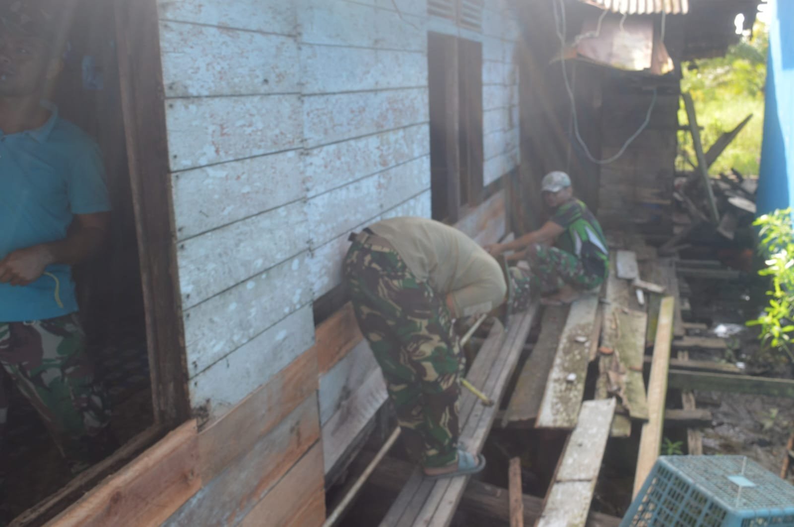 Sukamara – Satuan Tugas (Satgas) TNI Manunggal Membangun Desa (TMMD) ke-123 terus bekerja keras menyelesaikan renovasi Rumah Tidak Layak Huni (RTLH) milik Bapak Bakri, warga Desa Nibung, Kecamatan Jelai, Kabupaten Sukamara, Sabtu (15/03/2025).