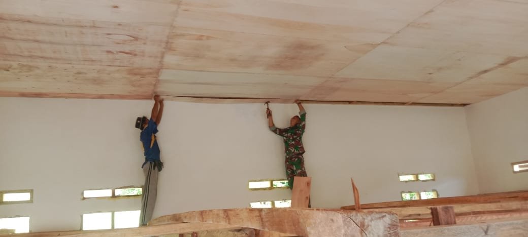 Proses pemasangan plafon ini dilakukan secara gotong royong oleh anggota Satgas TMMD bersama masyarakat setempat. Keterlibatan warga dalam pembangunan ini mencerminkan semangat kebersamaan antara TNI dan rakyat.