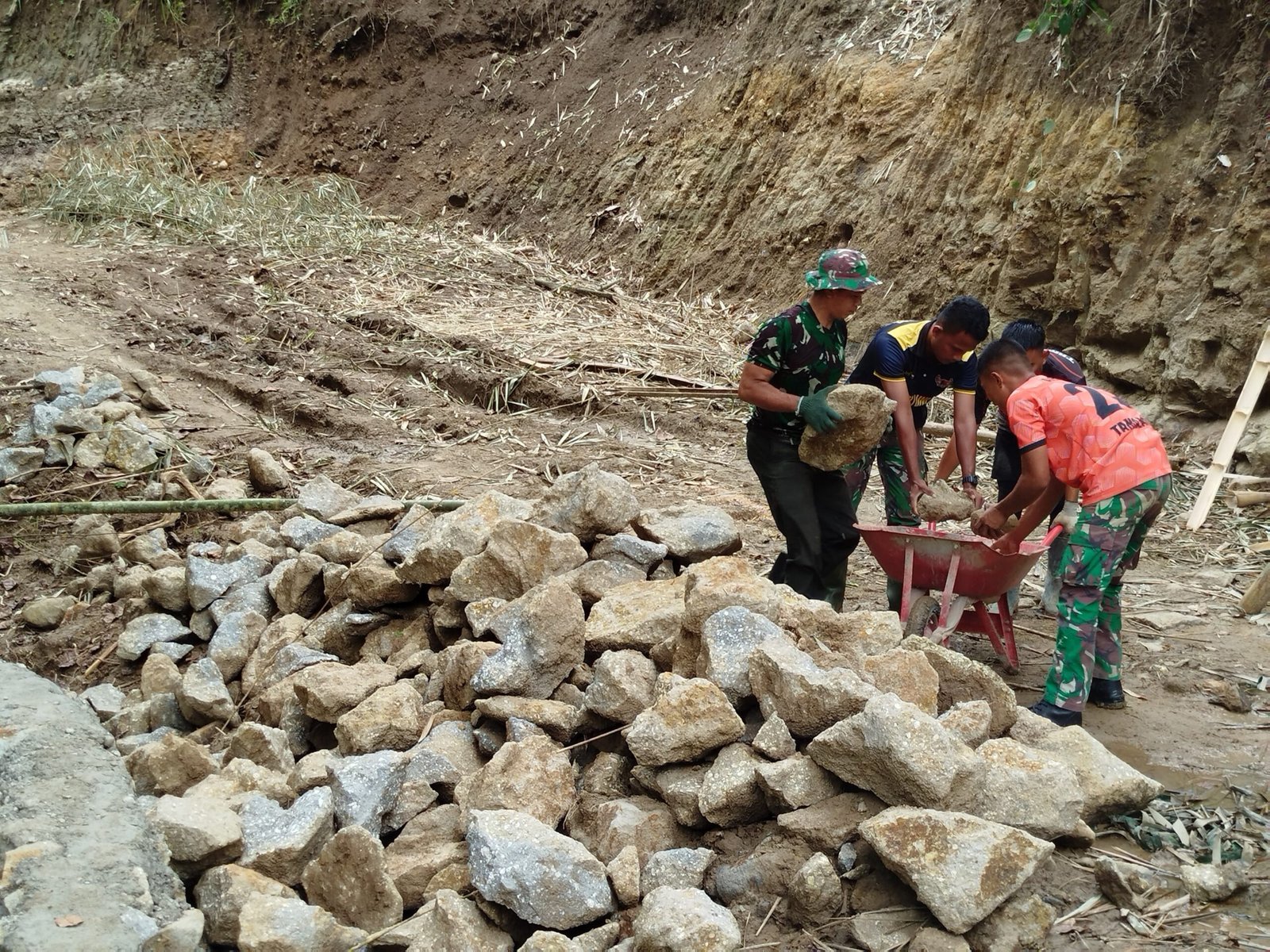 Meskipun pekerjaan ini cukup berat, semangat gotong royong tetap terpancar dari wajah para prajurit TNI yang bahu-membahu memastikan material sampai ke lokasi dengan lancar. Dengan menggunakan gerobak dorong, mereka dapat memindahkan batu dengan lebih efisien, mempercepat proses pembangunan tanpa mengandalkan alat berat.