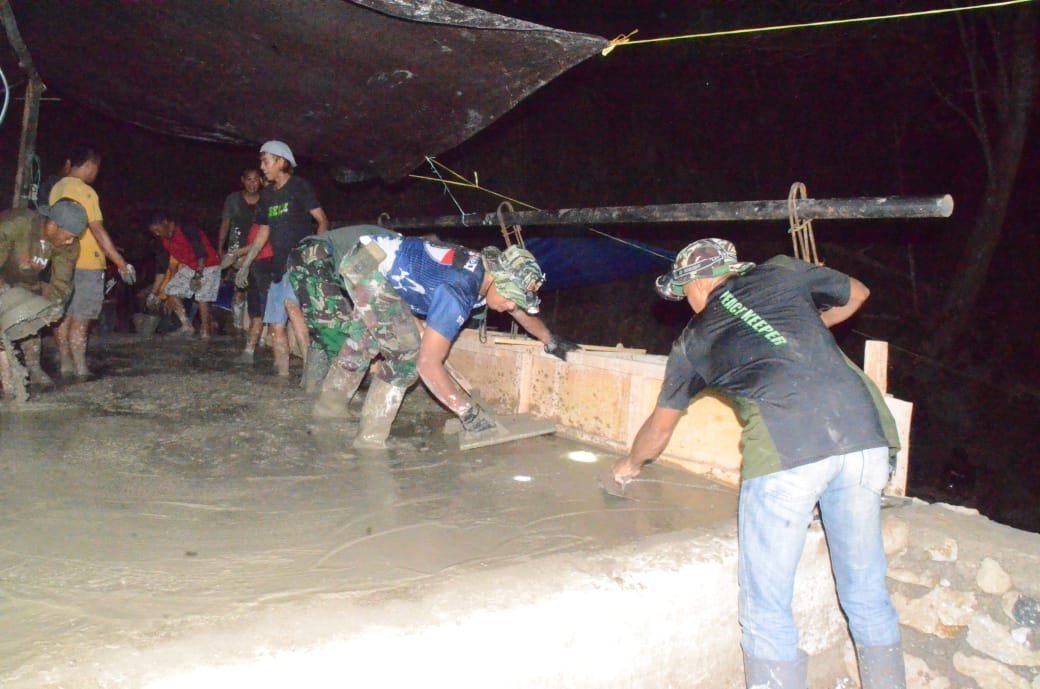 SINJAI. Satgas TNI Manunggal Membangun Desa (TMMD) ke-123 Kodim 1424/Sinjai terus menunjukkan dedikasi tinggi dalam percepatan pembangunan infrastruktur di Kabupaten Sinjai. Demi memastikan proyek berjalan sesuai target, personel Satgas melaksanakan pengecoran lantai jembatan di Desa Lamatti Riawang, Kecamatan Bulupoddo, pada malam hari, Senin (10/03/2025) Malam.