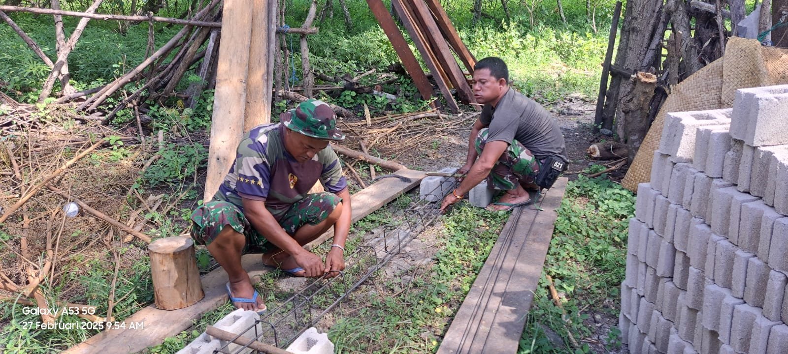 Satgas Tentara Manunggal Membangun Desa (TMMD) Ke-123 Kodim 1601/Sumba Timur di Desa Kaliuda bersama warga bahu membahu merangkai besi beton sloof untuk pengerjaan perehaban Rumah Tidak Layak Huni (RTLH) milik Bapak Daniel Umbu (52) warga Desa Kaliuda, Kecamatan Pahunga Lodu, Kabupanten Sumba Timur. Kamis (25/02/2025)
