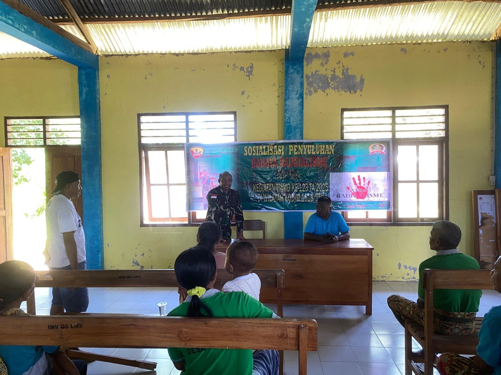 NTT–KEFAMENANU, Selasa 04 2025., Dalam upaya menjaga stabilitas keamanan dan meningkatkan pemahaman masyarakat tentang bahaya radikalisme, Satgas TMMD Ke-123 Kodim 1618/TTU menggelar Penyuluhan Bahaya Radikalisme di Aula Kantor Desa Lanaus, Kecamatan Insana Tengah, Kabupaten TTU. Kegiatan ini diikuti oleh masyarakat setempat dengan penuh antusias.