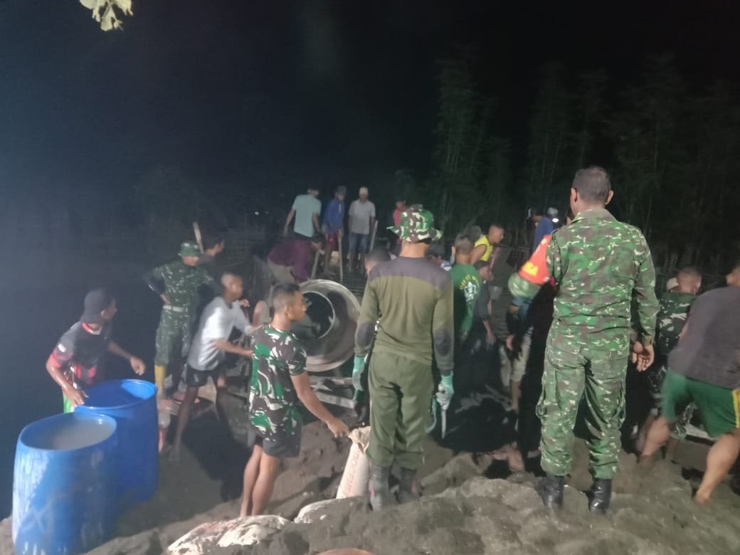 Satuan Tugas Tentara Manunggal Membangun Desa (Satgas TMMD) ke- 123 Kodim 1628/Sumbawa Barat melaksanakan kerja lembur agar pembangunan jembatan dan pengecoran jembatan jalan usaha tani tepat waktu penyelesaiannya, bertempat di Dusun Jorok Tiram Desa Batu Putih Kecamatan Taliwang Kabupaten Sumbawa Barat.