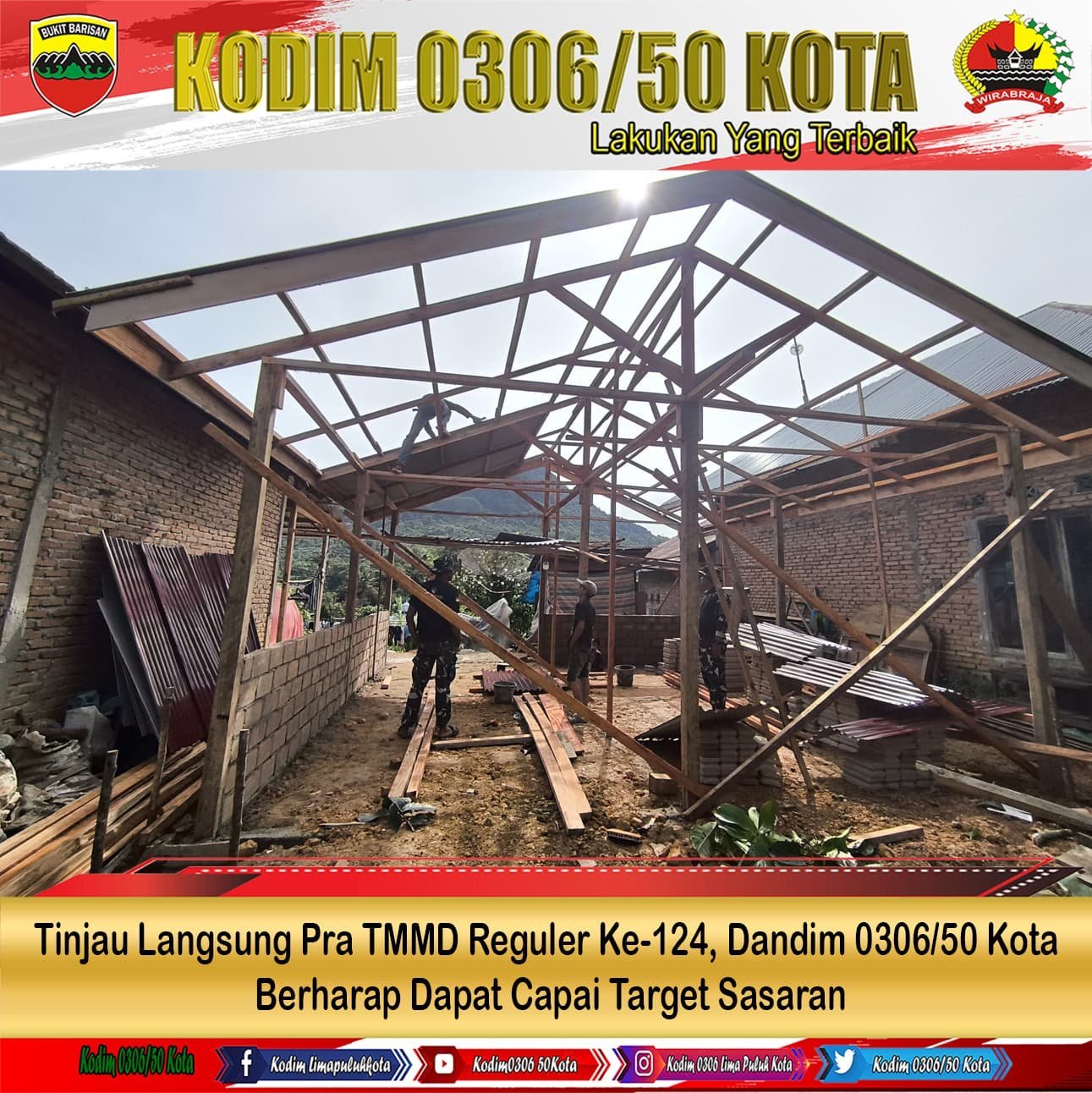Satgas TMMD Kodim 0306/50 Kota terus berlomba dengan waktu untuk segera menyelesaikan pembangunan RTLH milik Bapak Matrus seperti yang terlihat pada hari ini, masyarakat dan anggota yang tergabung dalam Satgas TMMD Ke-124 Kodim 0306/50 Kota melaksanakan penyelesaian pengerjaan pemasangan atap dan dinding yang dilaksanakan secara bergotong-royong agar pekerjaan semakin ringankan dan cepat selesai.