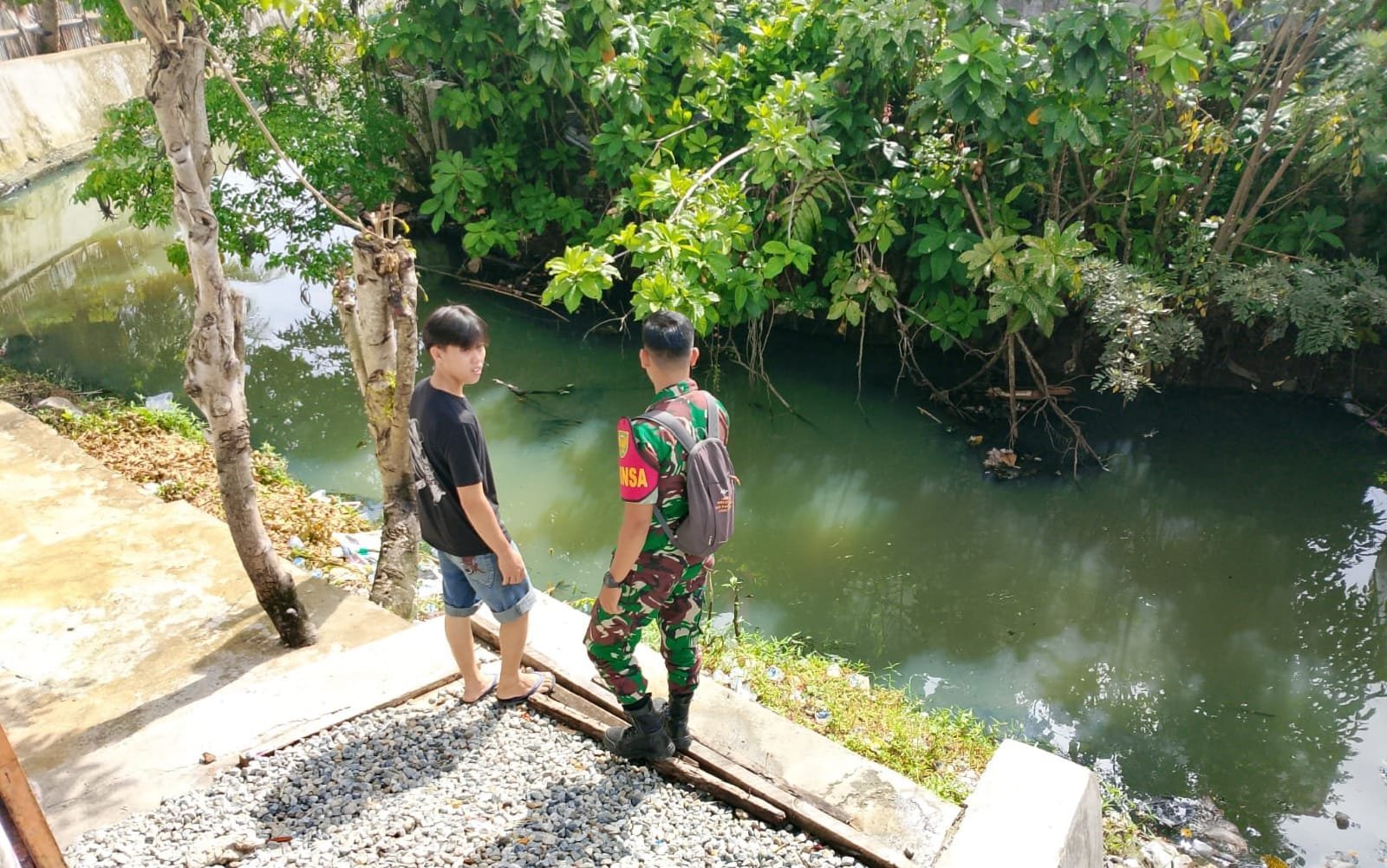 Bersama warga, personel Satgas memantau aliran sungai yang penun dengan tumpukan sampah, lumpur, dan ranting-ranting yang menyumbat aliran air.