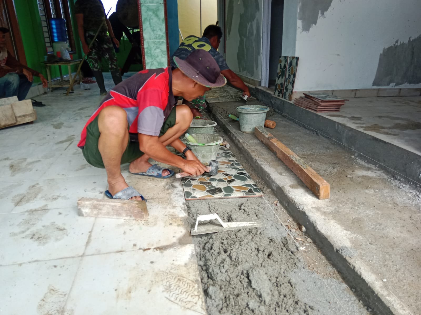 “Pengerjaan masih terus kita lanjutkan dan optimalkan, pemasangan keramik saat ini sudah mencapai tempat wudlu Masjid Nurul Hidayah, sebagian anggota juga ada yang didalam masjid melanjutkan pemasangan plafon” ujar Dan SSK Letda Inf Hariyanto Aswadi