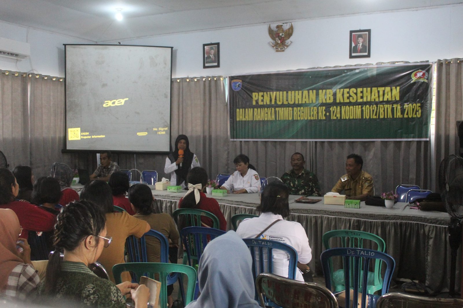 Barito Selatan, 30 Mei 2025 – Dalam rangkaian kegiatan TNI Manunggal Membangun Desa (TMMD) ke-124, Satgas dari Kodim 1012/Buntok menggelar penyuluhan Keluarga Berencana (KB) dan kesehatan di Balai Desa Talio, Kecamatan Karau Kuala, Kabupaten Barito Selatan. Kegiatan ini bertujuan meningkatkan pemahaman masyarakat terkait pentingnya menjaga kesehatan keluarga dan pengendalian angka kelahiran.