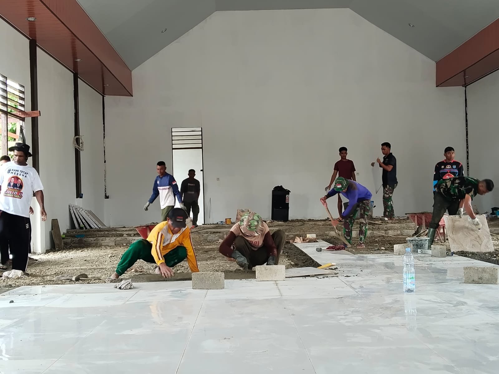 Nabire – Pekerjaan pemasangan lantai granit Gereja Talitakum, salah satu sasaran utama TMMD ke-125 TA. 2025 Kodim 1705/Nabire, terus menunjukkan perkembangan signifikan. Hingga Selasa (12/08/2025), Satgas TMMD bersama masyarakat setempat bahu-membahu mengerjakan pemasangan dengan penuh ketelitian dan semangat.