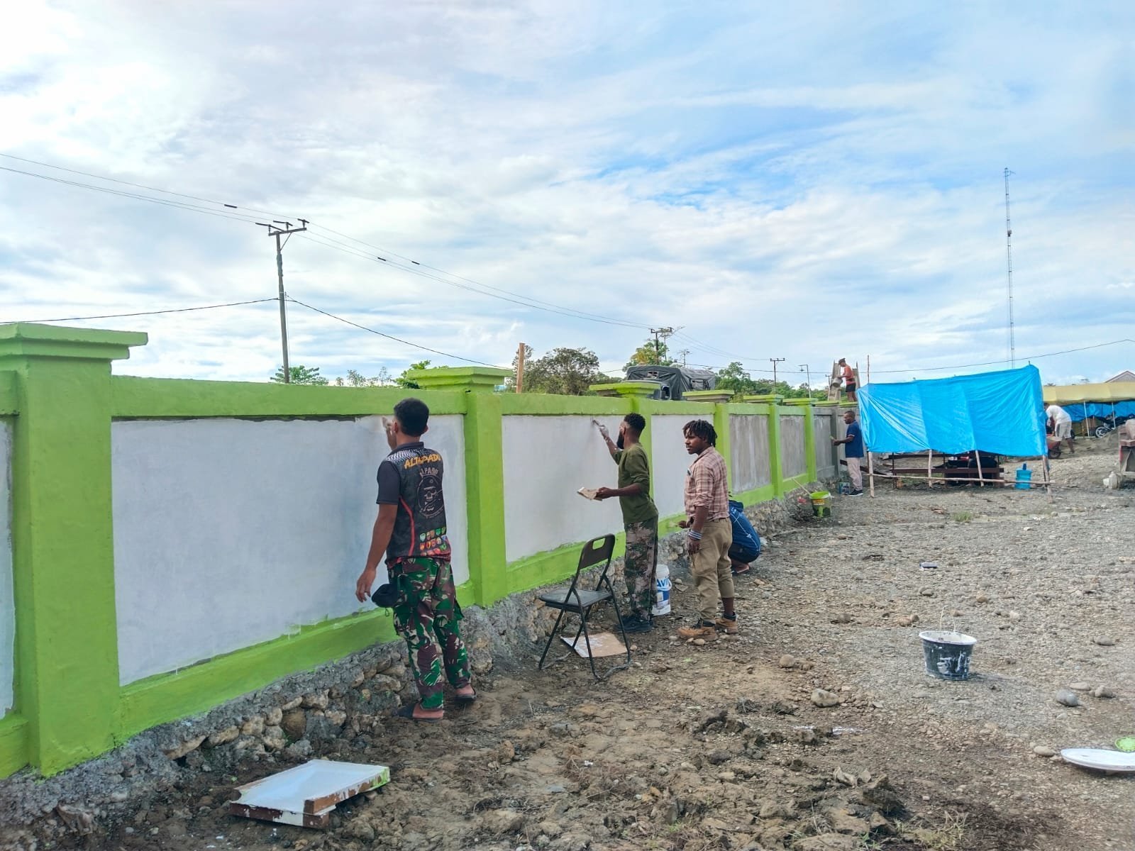 Satgas TMMD ke-125 dan Warga Nabire Gotong Royong Cat Pagar Gereja Talitakum