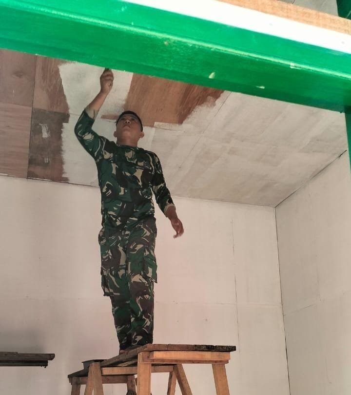 KUTAI TIMUR – Waktu pelaksanaan yang semakin sempit mendorong Satgas TNI Manunggal Membangun Desa (TMMD) Ke-125 Kodim 0909/Kutai Timur mempercepat pengerjaan sasaran fisik tambahan berupa rehabilitasi Rumah Tidak Layak Huni (RTLH) milik Rahman di Desa Suka Rahmat, Kecamatan Teluk Pandan. Karena tuntutan target tersebut, rumah yang sebelumnya reyot kini sudah memasuki tahap plamir pada dinding luar, dalam, dan plafon.