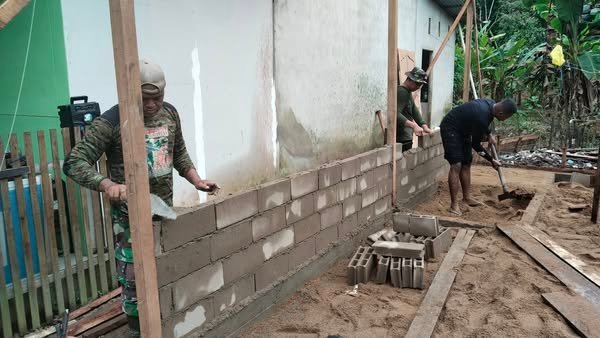 Di lokasi kegiatan, tampak personel Satgas TMMD bersama warga bekerja bahu membahu memasang batako dan membentuk struktur dasar bangunan rumah. Suasana gotong royong terlihat kental, mencerminkan semangat kebersamaan antara TNI dan masyarakat dalam mewujudkan rumah layak huni bagi warga yang membutuhkan.