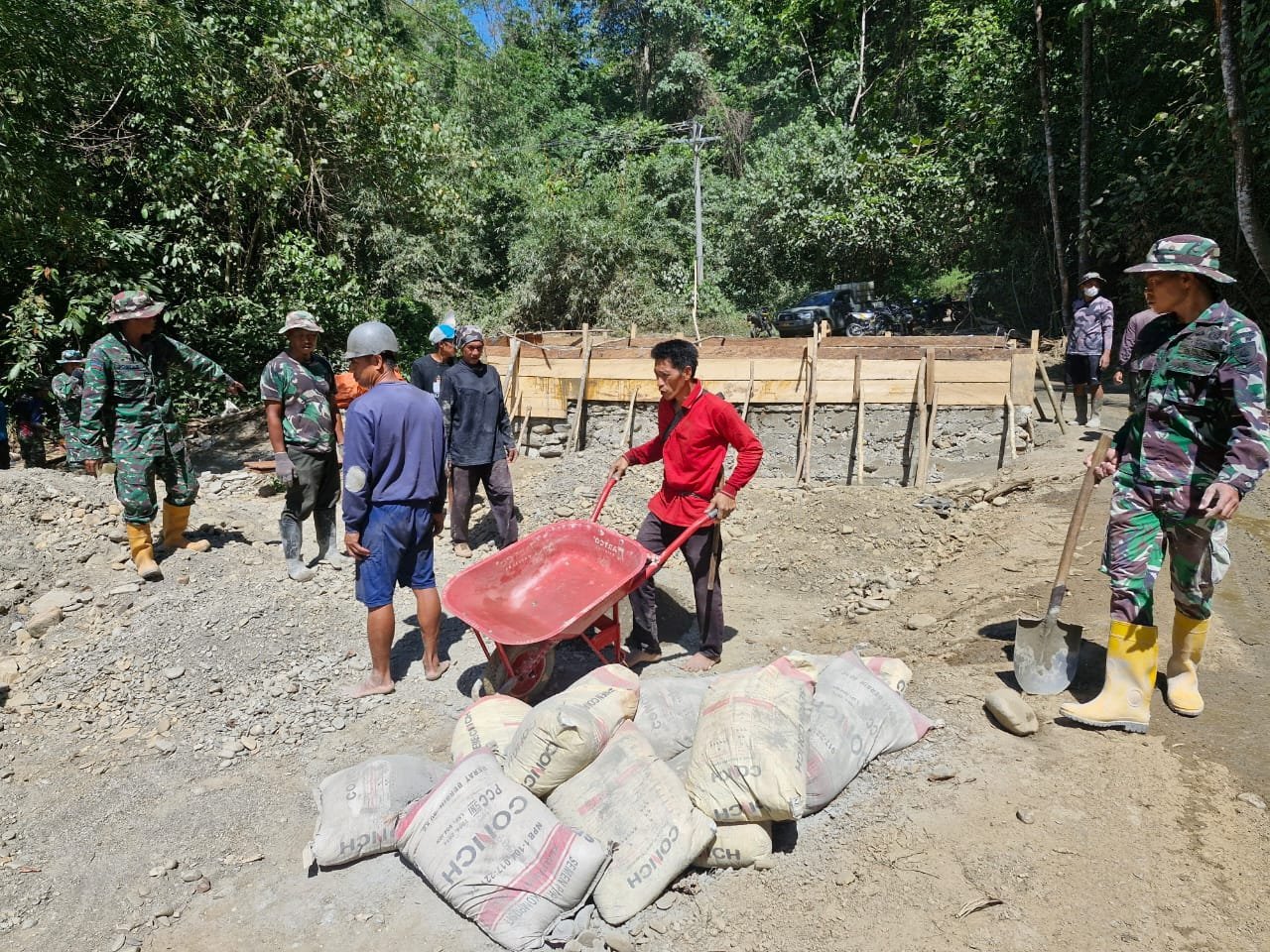 Dengan semangat kebersamaan, personel Satgas TMMD bahu-membahu bersama warga mengangkut pasir, kerikil, dan semen secara manual, kemudian menuangkan adonan beton ke dalam rangka besi deker yang telah disiapkan sebelumnya. Meskipun cuaca cukup terik, seluruh peserta kegiatan tampak tetap bersemangat hingga proses pengecoran selesai.