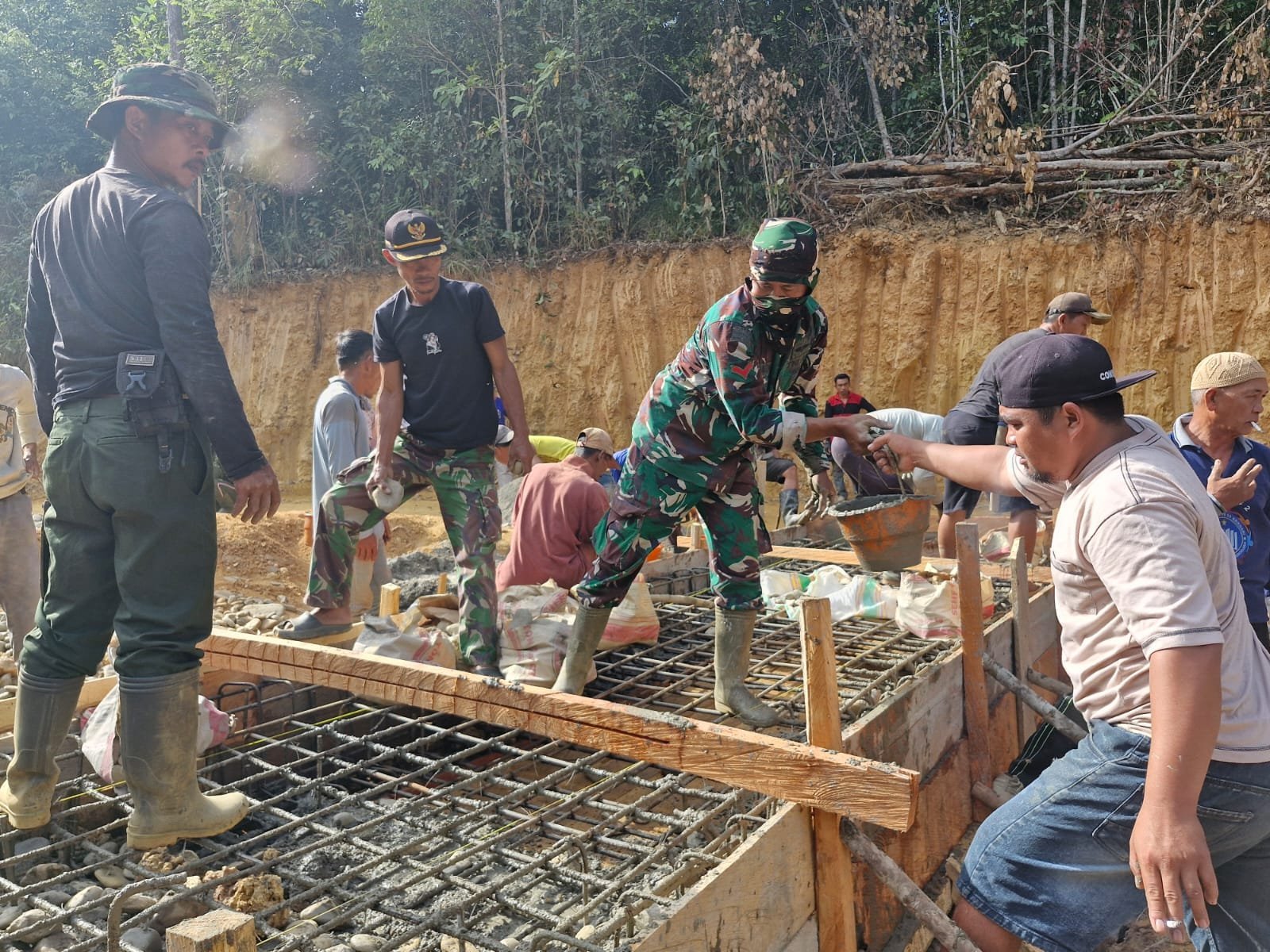 Di lokasi, terlihat anggota Satgas TMMD dan masyarakat bekerja penuh semangat. Mereka bahu-membahu mengangkut material seperti pasir, semen, dan batu kerikil untuk kemudian melakukan proses pengecoran secara manual. Suasana gotong royong begitu terasa di bawah teriknya matahari siang.