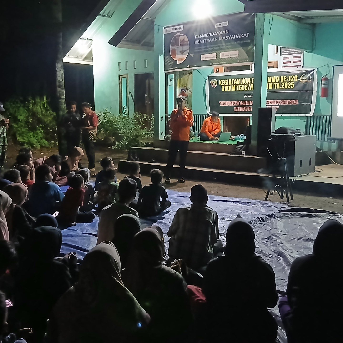 Lombok Barat, NTB – Satuan Tugas (Satgas) TNI Manunggal Membangun Desa (TMMD) ke-126 Komando Distrik Militer (Kodim) 1606/Mataram bekerja sama dengan Dinas Kesehatan (Dinkes) dan Badan Penanggulangan Bencana Daerah (BPBD) Kabupaten Lombok Barat (Lobar) menggelar kegiatan sosialisasi kesehatan lingkungan dan penanggulangan bencana alam di Rumah Produksi Gula Aren, Dusun Tempos Madani, Desa Giri Madia, Kecamatan Lingsar, Lobar, Sabtu malam (25/10/2025).