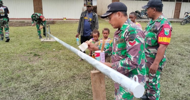 Satgas TMMD ke-126 Kodim 1702/Jayawijaya Cat Ulang Tiang Bendera SD Inpres Algonik, Tanamkan Semangat Nasionalisme Sejak Dini