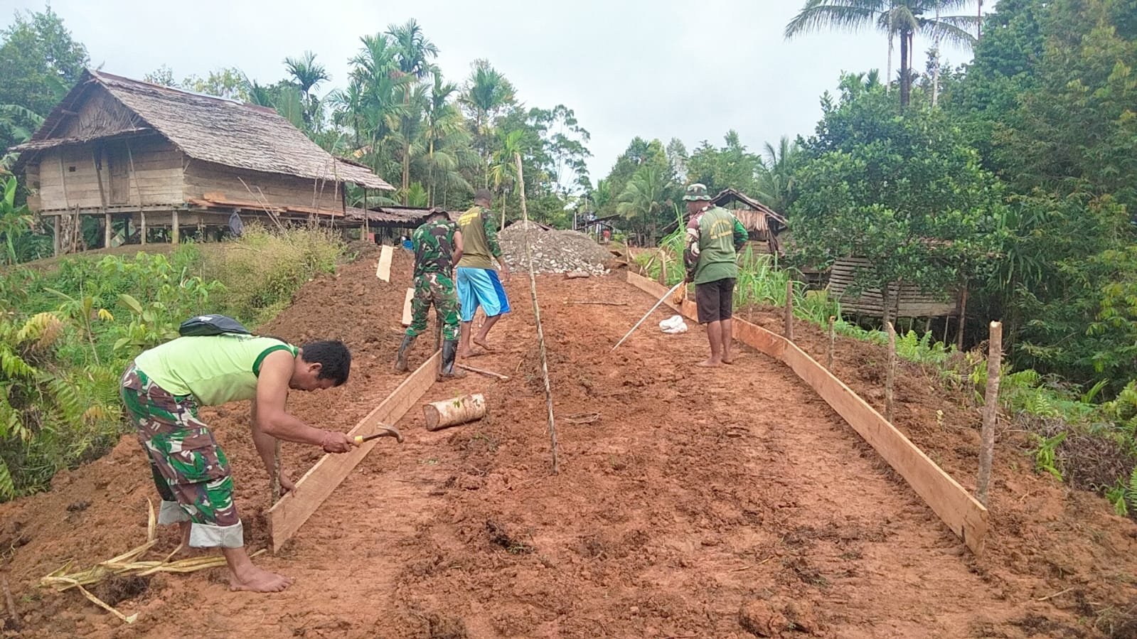Boven Digoel – Satuan Tugas TNI Manunggal Membangun Desa (TMMD) ke-126 Kodim 1711/Boven Digoel (BVD) terus melanjutkan pekerjaan pembangunan jalan di Kampung Waropko, Distrik Waropko, Kabupaten Boven Digoel, dengan melakukan pemasangan papan mal sebagai tahap awal persiapan pengecoran jalan, Jumat (10/10/2025).