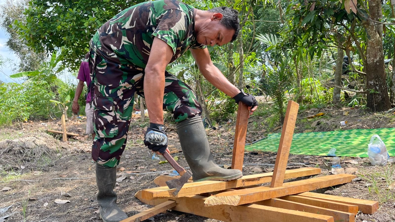 Dengan alat sederhana, mereka meruncingkan kayu ulin untuk dijadikan tonggak pancang tiang bangunan rumah. Aktivitas itu mungkin terlihat kecil, namun menjadi bagian penting dalam proses mewujudkan tempat tinggal layak bagi warga yang membutuhkan.