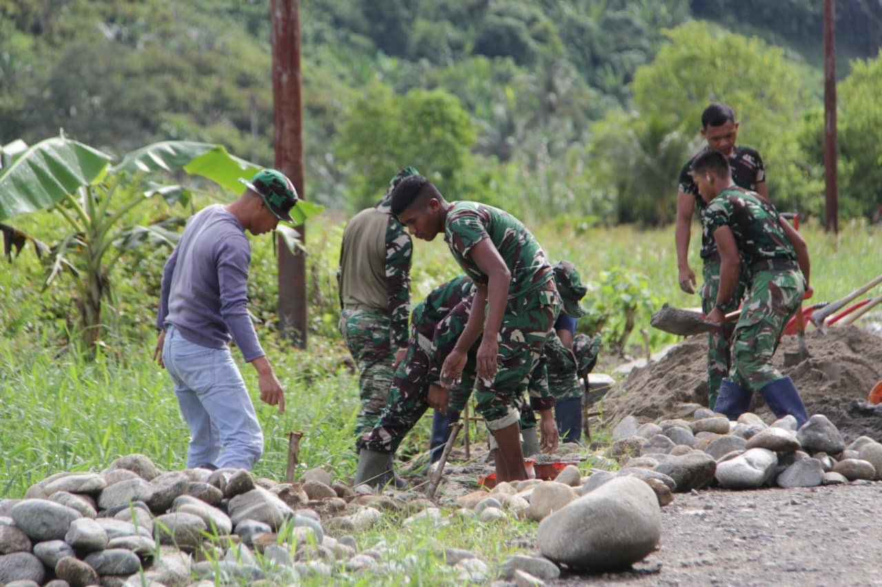 Semangat gotong royong antara prajurit dan warga terlihat jelas selama proses pembangunan berlangsung, menunjukkan kuatnya kemanunggalan TNI dengan rakyat.