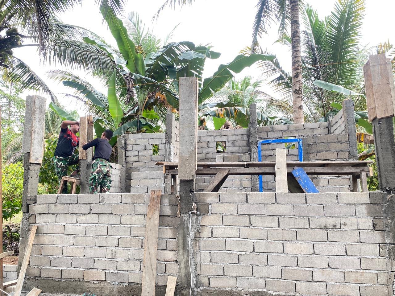 Personel Satgas dan warga bahu-membahu menyelesaikan pemasangan dinding serta mempersiapkan bagian atap. Semangat gotong royong menjadi kekuatan utama dalam mempercepat penyelesaian sasaran fisik TMMD.