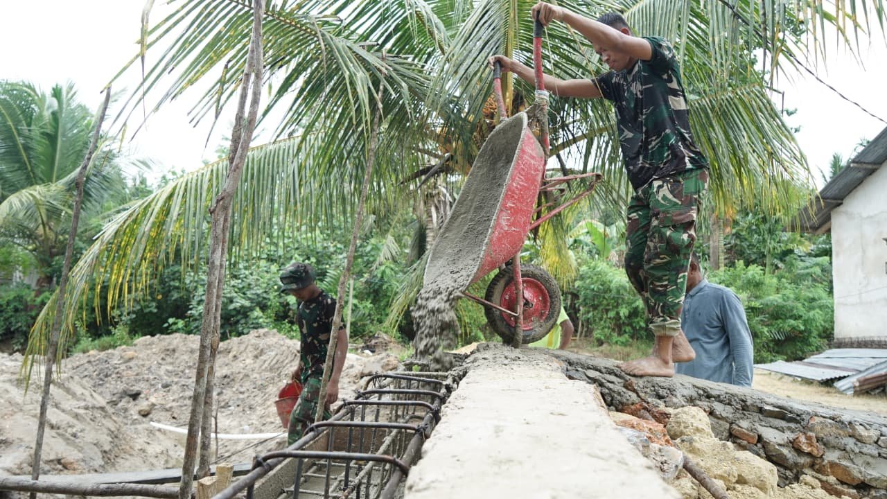 Di lokasi kegiatan, para prajurit tampak kompak memindahkan material cor secara manual untuk memastikan proses pengisian balok berjalan maksimal. Kerja sama tim menjadi kunci utama agar tahapan krusial ini tetap sesuai target.