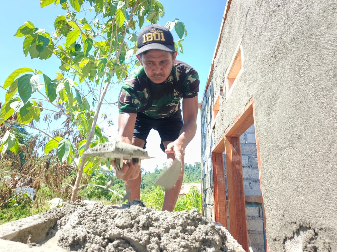 Manokwari Utara — Pembangunan Rumah Tidak Layak Huni (RTLH) pada TMMD ke-128 Kodim 1801/Manokwari telah menunjukkan kemajuan yang cukup pesat. Pada Selasa (28/04/2026), salah satu unit rumah di Kampung Tanah Rubuh telah mulai menjalani proses plester dinding.