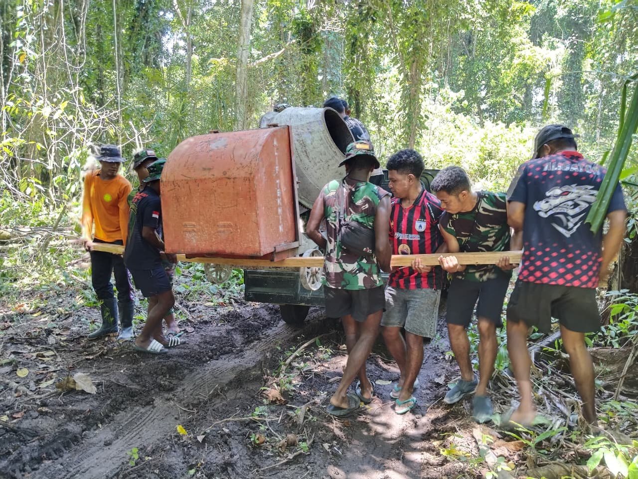 Mereka dihadapkan pada jalan-jalan yang sempit dan licin, namun personel Satgas tetap fokus menyalurkan peralatan yang diperlukan untuk proyek pembangunan. Dengan penuh kehati-hatian, alat-alat tersebut diangkut secara manual menuju lokasi tujuan untuk memastikan keamanannya.