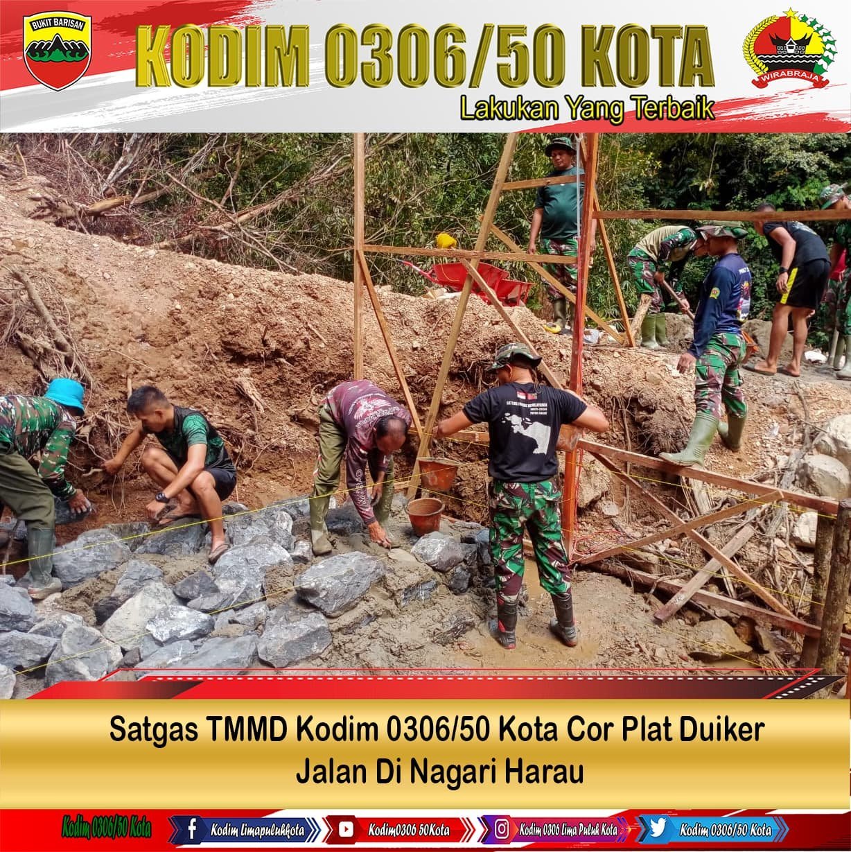 Lima Puluh Kota — Program TNI Manunggal Membangun Desa (TMMD) ke 124 Kodim 0306/50 Kota terus berlangsung. Saat ini Satgas terus bekerja keras menyelesaikan pembangunan plat duiker di Nagari Harau Kecamatan Harau Kabupaten 50 Kota. Minggu (25/5/2025).