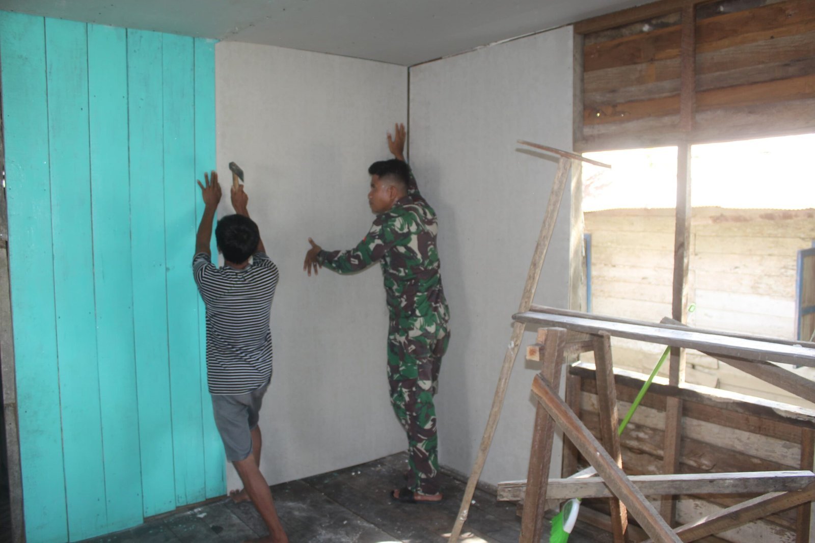 “Salah satu anggota Satgas TMMD mengatakan, pemasangan dinding ini merupakan tahap penting untuk mempercepat penyelesaian rehab rumah, agar pemilik segera bisa menempatinya,” ujarnya saat ditemui di lokasi.