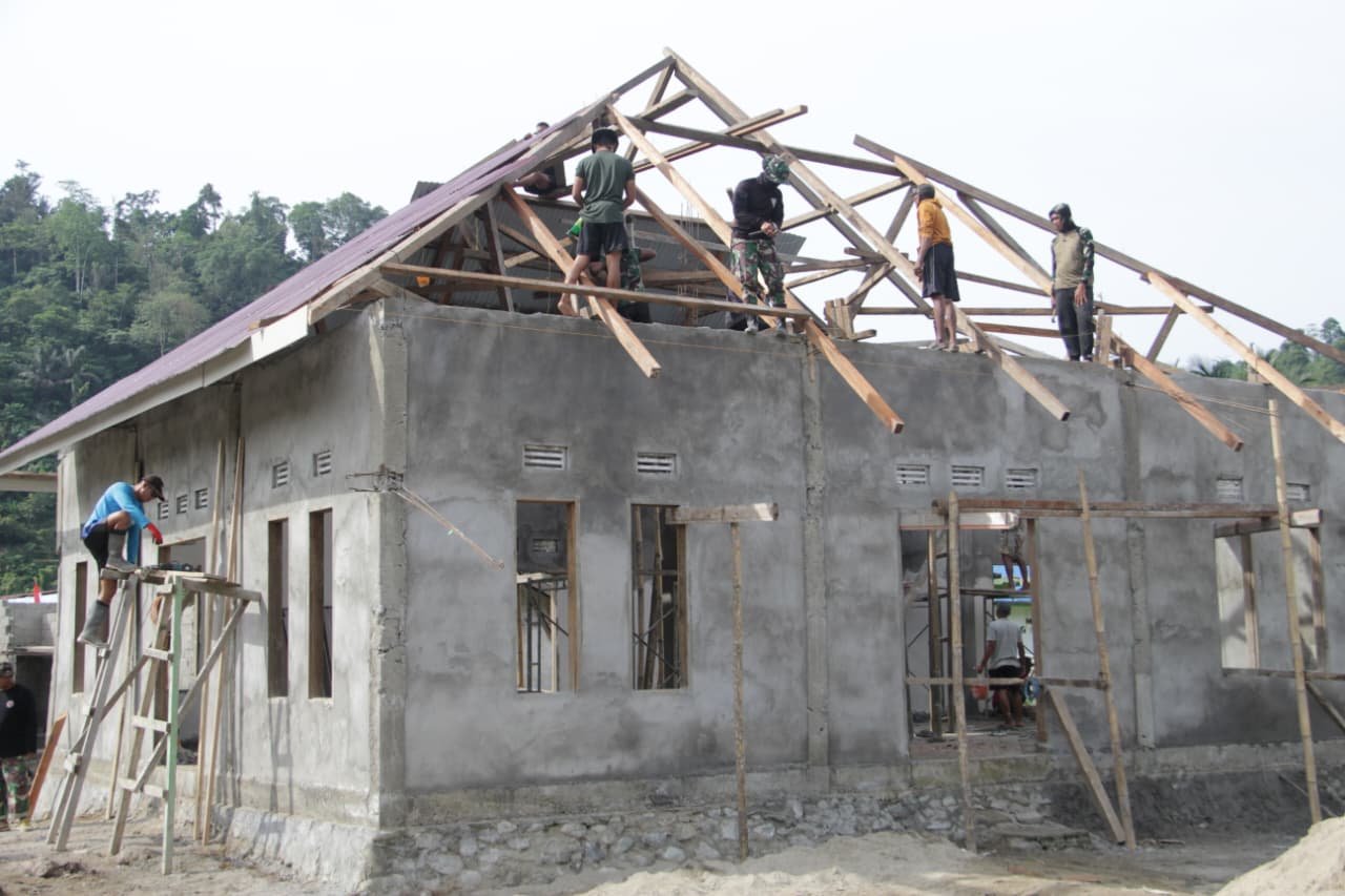 Tanpa ragu, para personel Satgas TMMD naik ke atas rangka bangunan untuk memasang atap demi mempercepat proses penyelesaian. Meski pekerjaan tersebut membutuhkan ketelitian dan keberanian karena berada di ketinggian, hal itu tidak menyurutkan semangat para prajurit dalam membantu masyarakat.