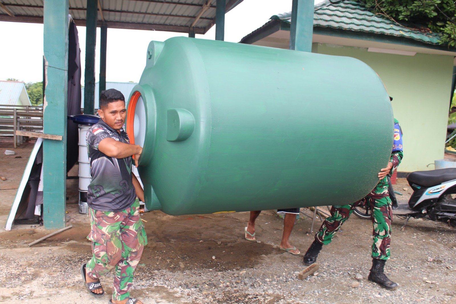 Terlihat beberapa anggota Satgas TMMD bergotong royong menurunkan tandon air berukuran besar dari kendaraan pengangkut. Karena ukurannya yang cukup besar, proses pemindahan ini dilakukan secara bersama-sama agar dapat ditempatkan di lokasi yang telah ditentukan.
