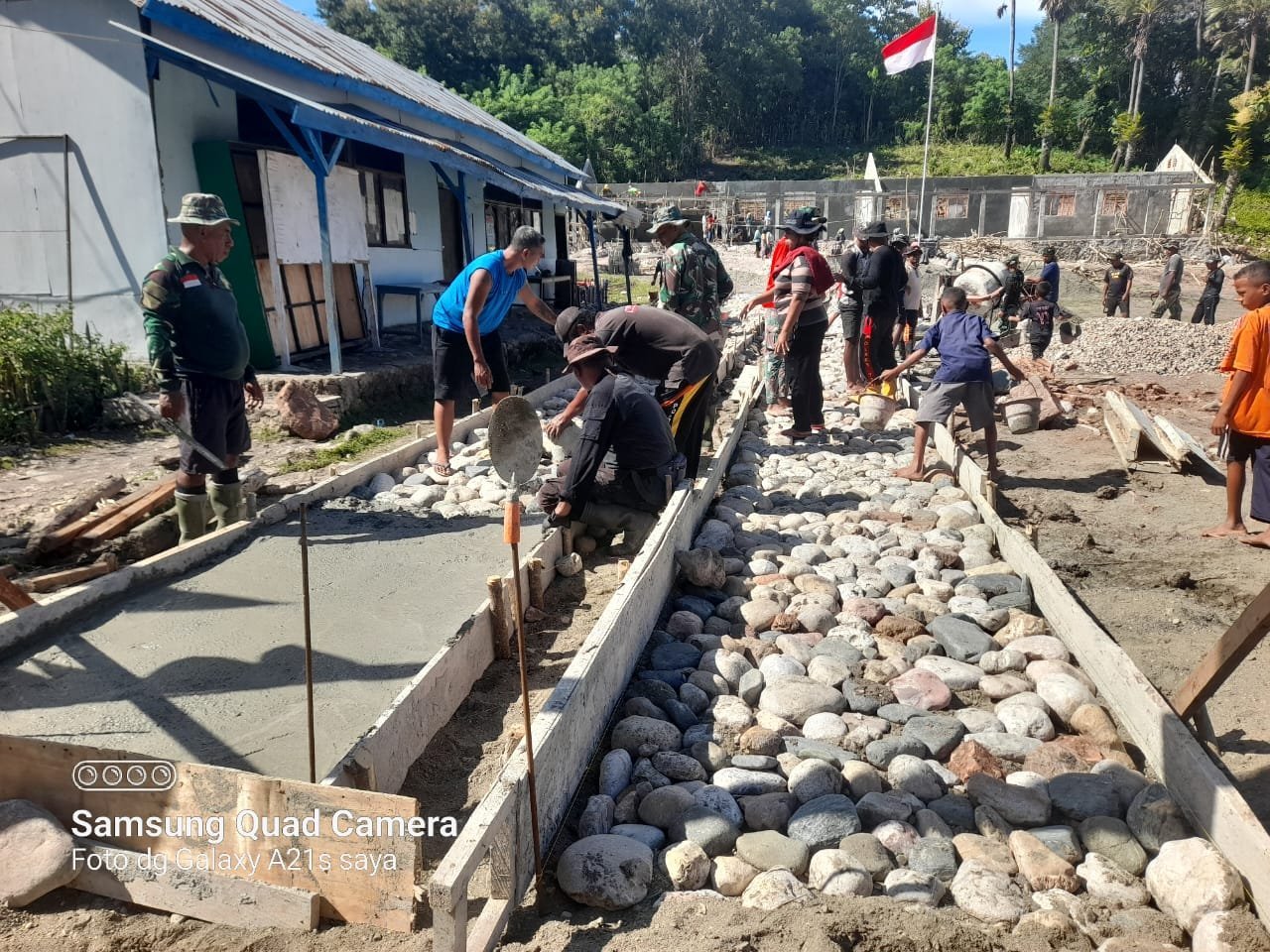 NTT – Kefamenanu – Semangat gotong royong terlihat jelas dalam pelaksanaan TNI Manunggal Membangun Desa (TMMD) ke-123 Kodim 1618/TTU. Personel Satgas TMMD bersama masyarakat setempat bekerja keras melakukan pengecoran jalan di salah satu titik sasaran pembangunan di Kecamatan Insana Tengah, Kabupaten TTU.