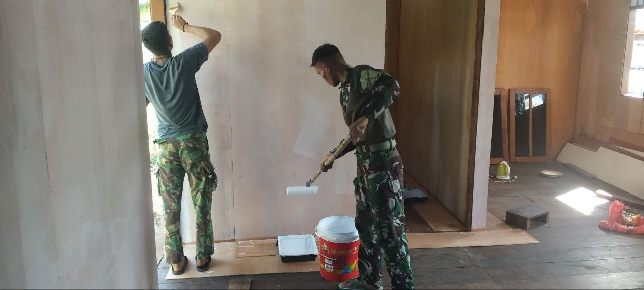 Anggota Satgas TMMD, Pelda Tori Suwandi selaku tukang di lapangan, menyampaikan bahwa pengecatan dinding sangat penting untuk menjaga kondisi fisik maupun psikologis para anggota yang bertugas dalam jangka waktu panjang.
