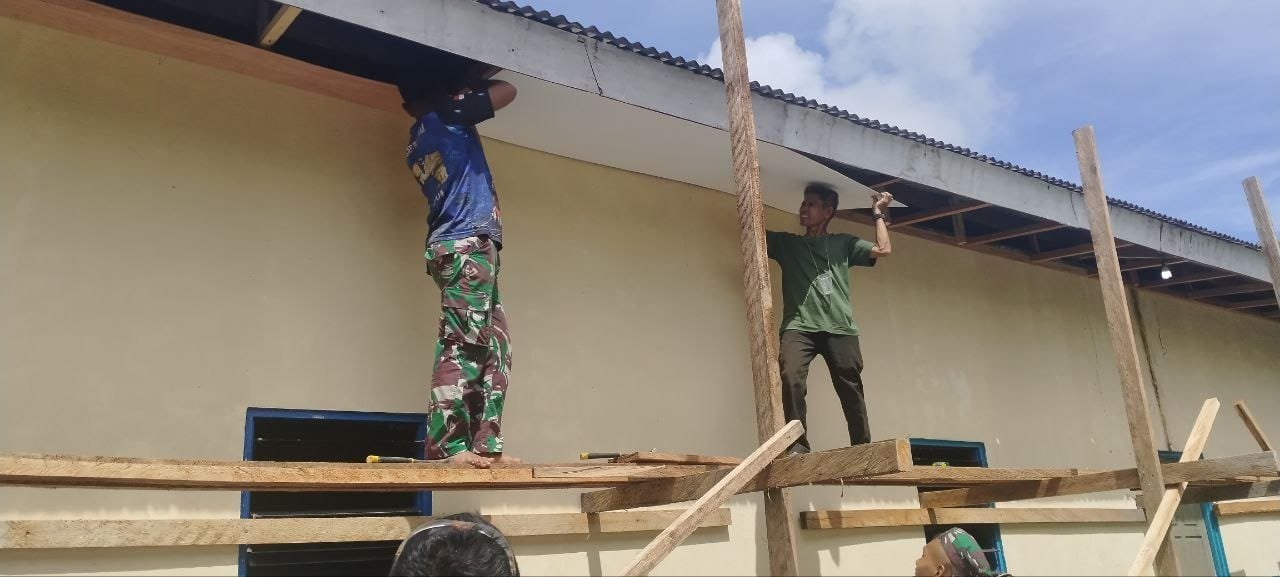 Pada hari ini, personel Satgas TMMD bersama warga setempat melaksanakan proses pemasangan plafon di bagian luar gereja. Kegiatan ini merupakan bagian dari rangkaian pekerjaan renovasi yang telah dimulai sejak pembukaan TMMD beberapa waktu lalu.