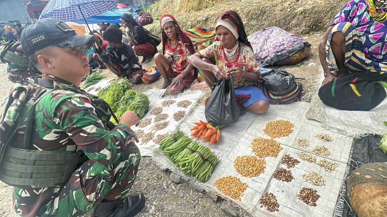 TOLIKARA – Dalam upaya meningkatkan kesejahteraan masyarakat dan mempererat hubungan TNI dengan Rakyat, Satgas Yonif 614/RJP Pos Karubaga yang dipimpin oleh Sertu Syahrul bersama beberapa personel Pos Karubaga melakukan aksi memborong hasil bumi di Pasar tradisional Karubaga Jalan Irian, Desa Danggulurik, Distrik Karubaga, Kabupaten Tolikara, Papua Pegunungan, Selasa (10/5/2025).