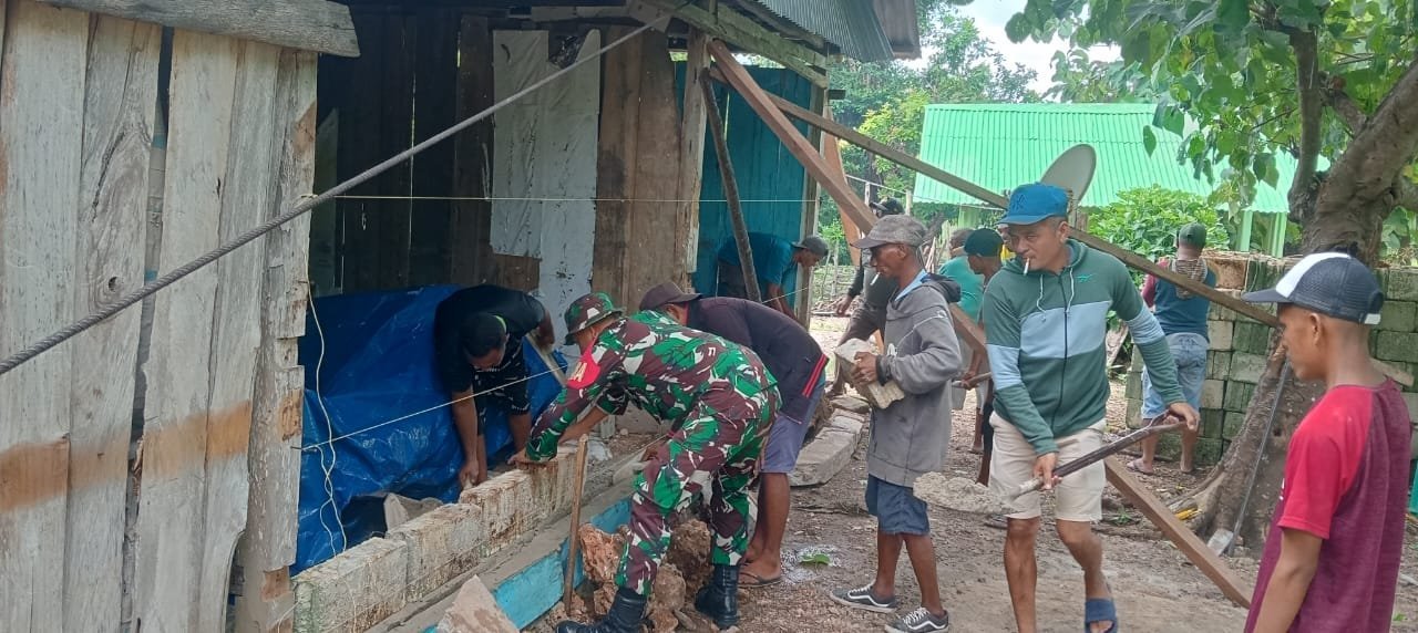 NTT Rote Ndao – Kopda Grani Fia Babinsa Koramil 02/Pantai Baru Kodim 1627/Rote Ndao bersama warga bantu bangun rumah milik Ibu Marice Ndun, bertempat di Desa Tungganamo kecamatan Pantai Baru Kabupaten Rote Ndao, untuk saling peduli dan semangat bahu – membahu bekerja sama dalam Membangun rumah.