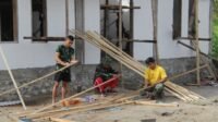 Para prajurit bahu-membahu melaksanakan berbagai tahapan pekerjaan, mulai dari pemasangan rangka kayu bagian atas hingga proses perapian atau pemeluran lantai bangunan.