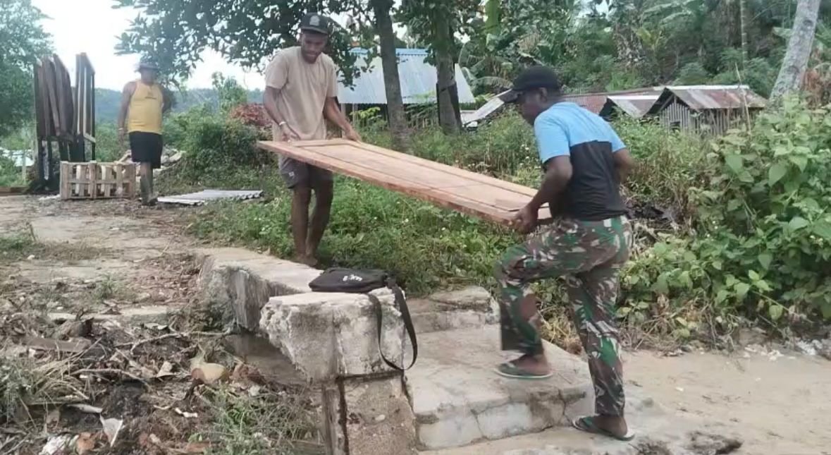 Anggota Satgas bersama warga memindahkan bahan bangunan dari perahu utama ke perahu kecil yang digunakan untuk menjangkau lokasi sasaran pembangunan. Kondisi geografis wilayah yang didominasi perairan menjadi tantangan tersendiri, namun tidak menyurutkan semangat personel dan masyarakat dalam menyukseskan program TMMD.