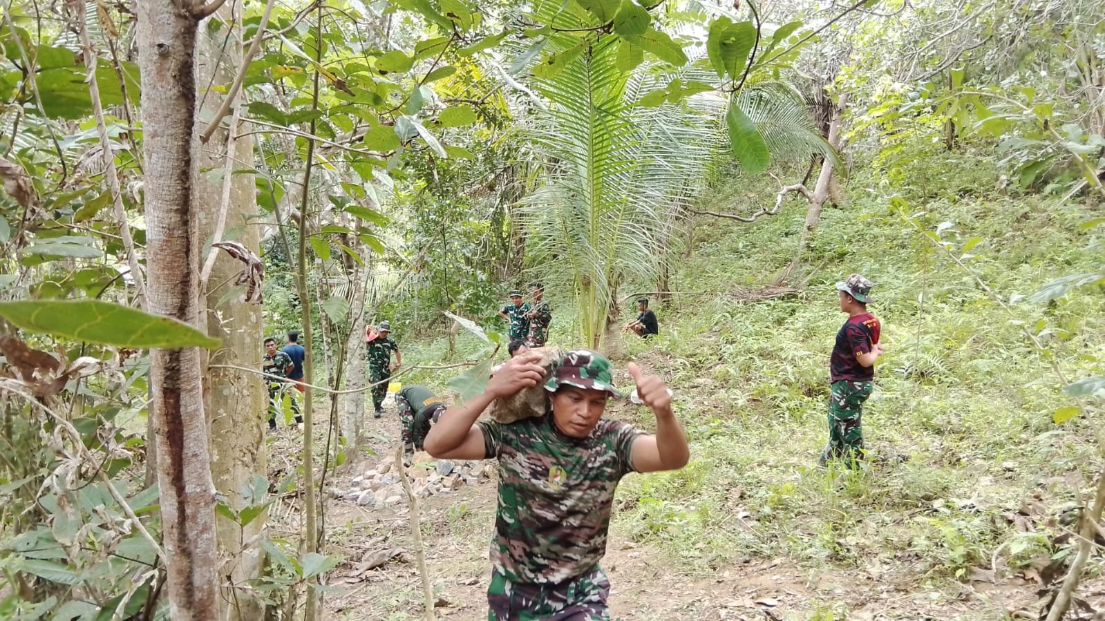Sejak pagi hari, prajurit dan masyarakat tampak kompak mengangkut material secara bersama-sama. Meski pekerjaan tergolong berat, suasana tetap dipenuhi tawa dan obrolan santai yang mencairkan rasa lelah selama bekerja.