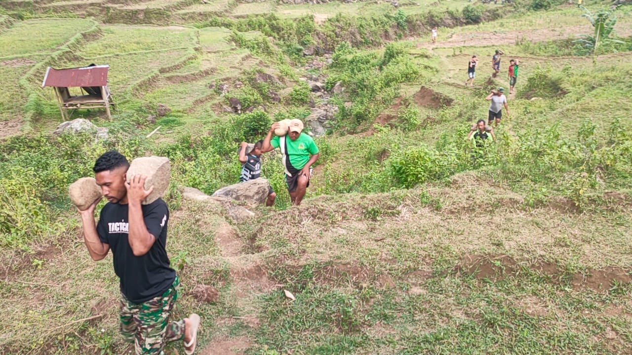 Sejak pagi hari, prajurit dan warga terlihat antusias memindahkan batu dari lokasi pengambilan menuju titik pembangunan. Kegiatan ini menjadi wujud nyata sinergi antara TNI dan masyarakat dalam mempercepat pembangunan infrastruktur pertanian di daerah.
