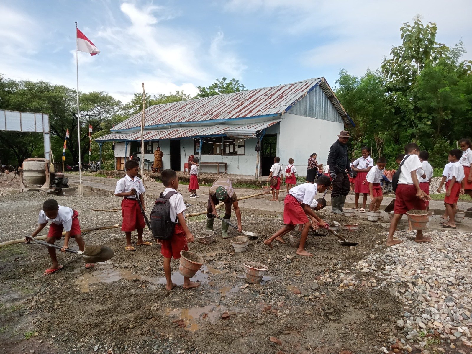 Di bawah terik matahari pagi, anak-anak kecil itu tak mengenal ada kata lelah. Dengan tangan mungil mereka, ember demi ember pasir diangkut ke lokasi yang telah ditentukan. Tidak ada paksaan, hanya kebanggaan karena mereka ikut andil dalam pembangunan sekolah mereka sendiri.